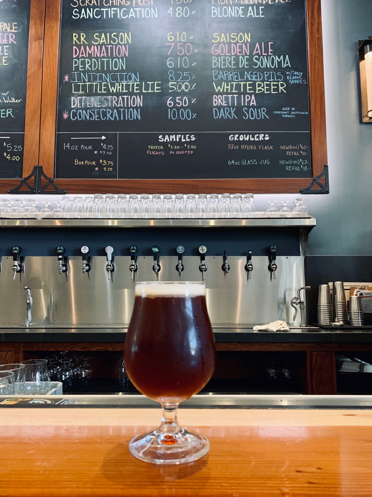 This being my first trip home in six months, and only second time in the past two years, I couldn’t wait to check out the brand spankin’ new Russian River Brewing facility located in Windsor, CA. Located 9 miles north of the original brewpub in downtown Santa Rosa, this facility is truly state of the art. They offer guided tours, or you can do a self guided tour. There’s a huge restaurant and bar area inside, and a gorgeous patio in the back. You can get most of, if not all, your favorite Russian River brews to go either in bottle or Growler format in their merchandise shop. I sat at their bar first, enjoying a few samplers of their beers. Served in 2 oz format this is a great way to whet your whistle for what you may want next. I then moved onto their “Biere de Sonoma”, an homage to Sonoma County in the form of a Biere de Garde. This quaffable beer is malty yet well balanced with a notable yeast presence, and doesn’t taste as heavy as it may look.